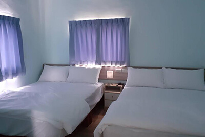 二樓陽光家庭六人房有獨立的陽台,還有採光極佳的四面窗戶、淺芸的窗簾,光線讓整間房間都是淡淡的海天芸色,帶給您極佳的度假愉快心情,